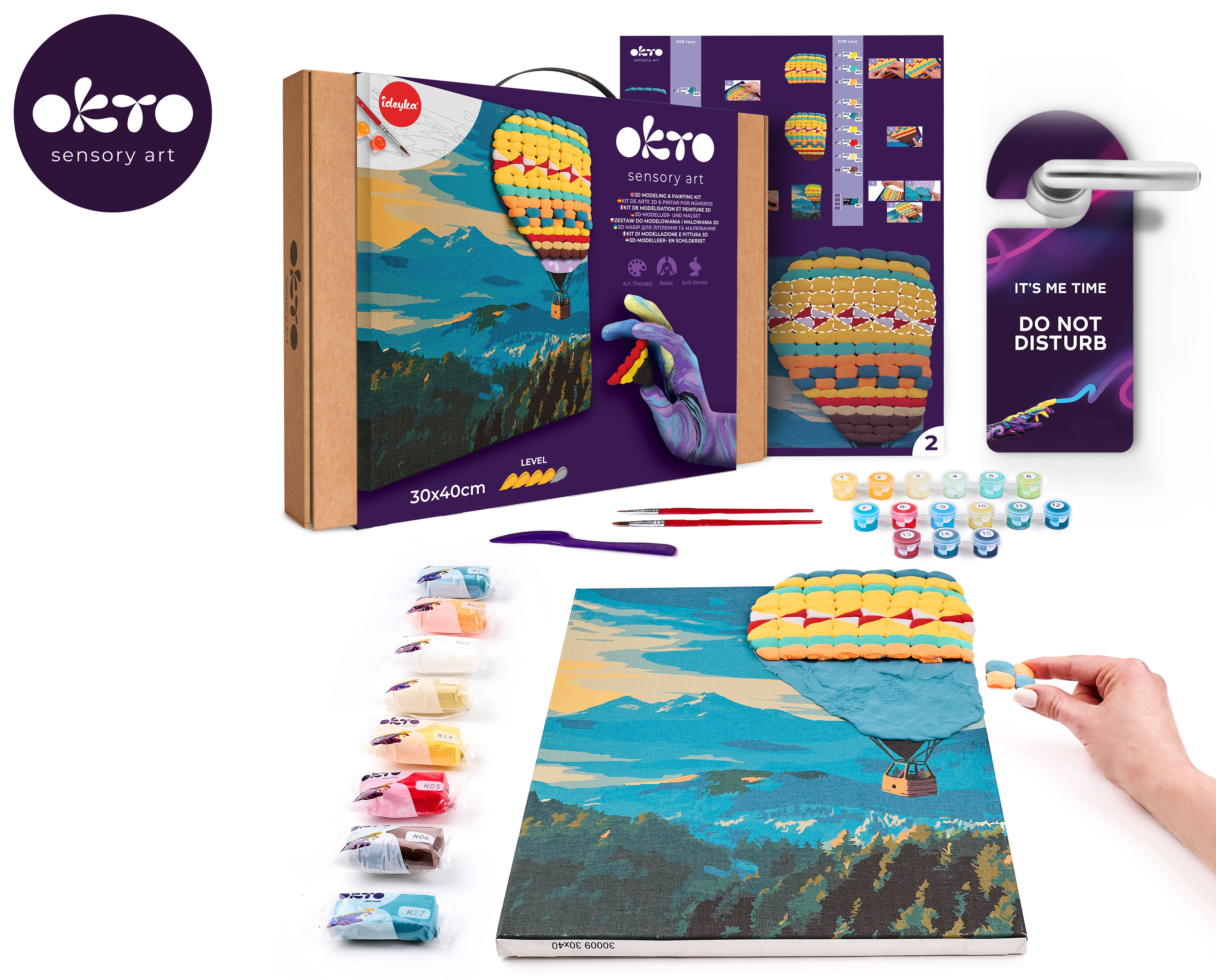 OKTO Malba a 3D modelování obraz "Hot Air Balloon Flight". Velikost plátna 30x40 cm. Vymalujte obrázek podle čísel a vytvarujte 3D prvek obrazu. Obtížnost 4/5. Obsah balení - plátno, obrázkový návod, modelovací nástroj, sada samoschnoucí modelovací hmoty, set barev na malování, štětec.