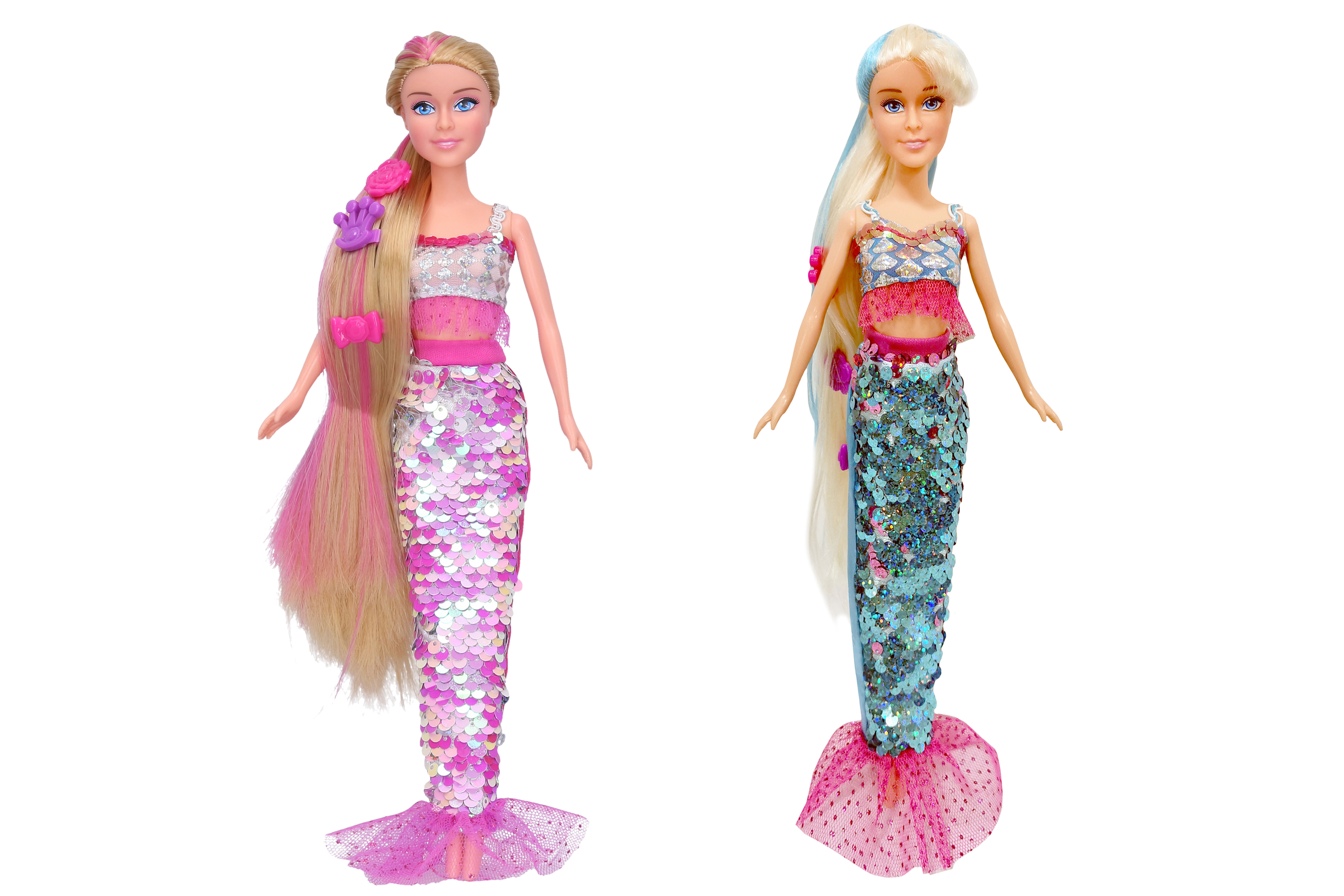 Panenka mořská panna s doplňky. Velikost 29cm. Doplňky: šperky pro panenku, figurka delfína, hřeben na vlasy. Asort: modrá, růžová
