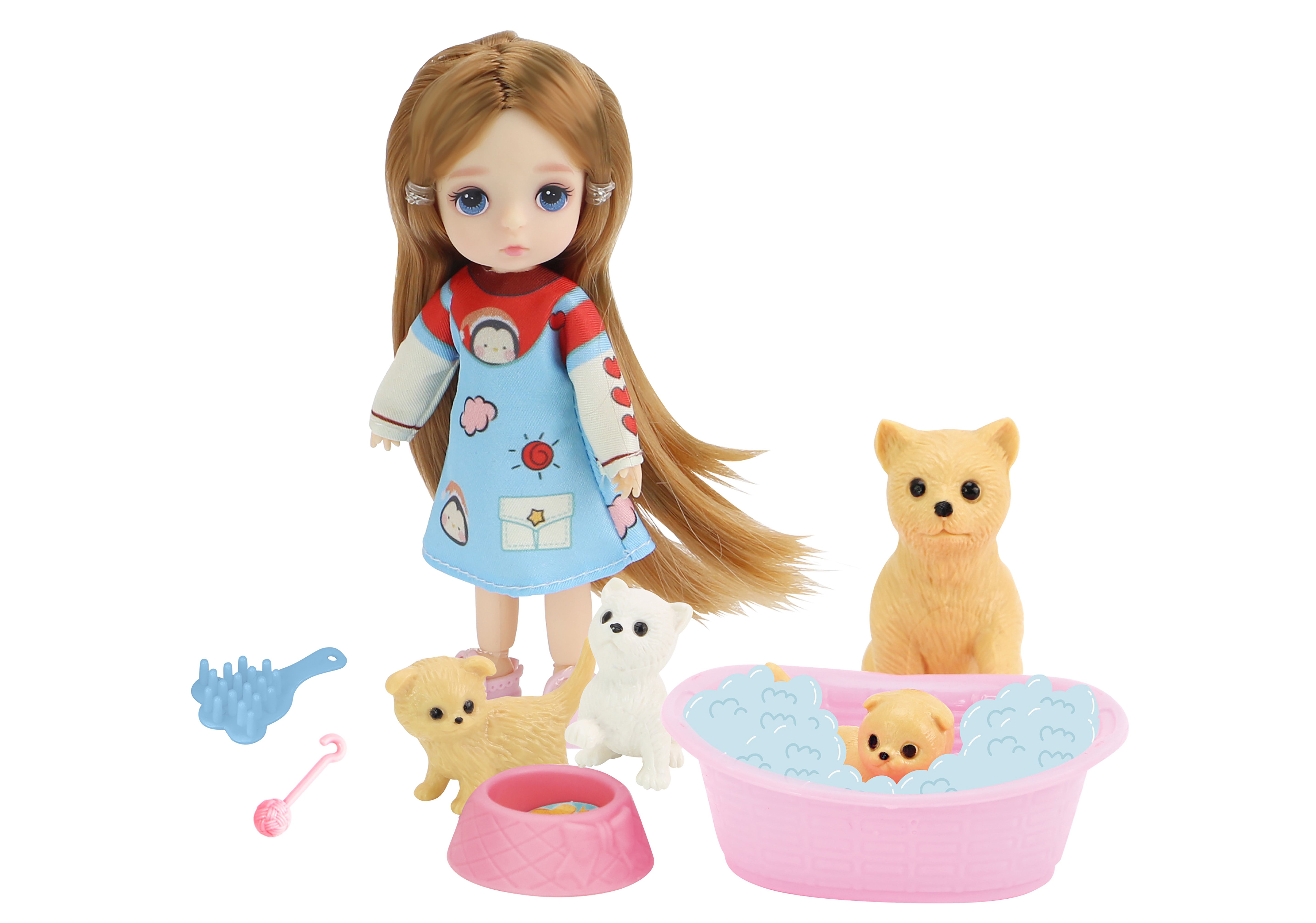 Panenka s pejsky. Velikost 12.5*3*1.5cm. Obsahuje: panenku, 3pejsky, příslušenství pro pejsky.