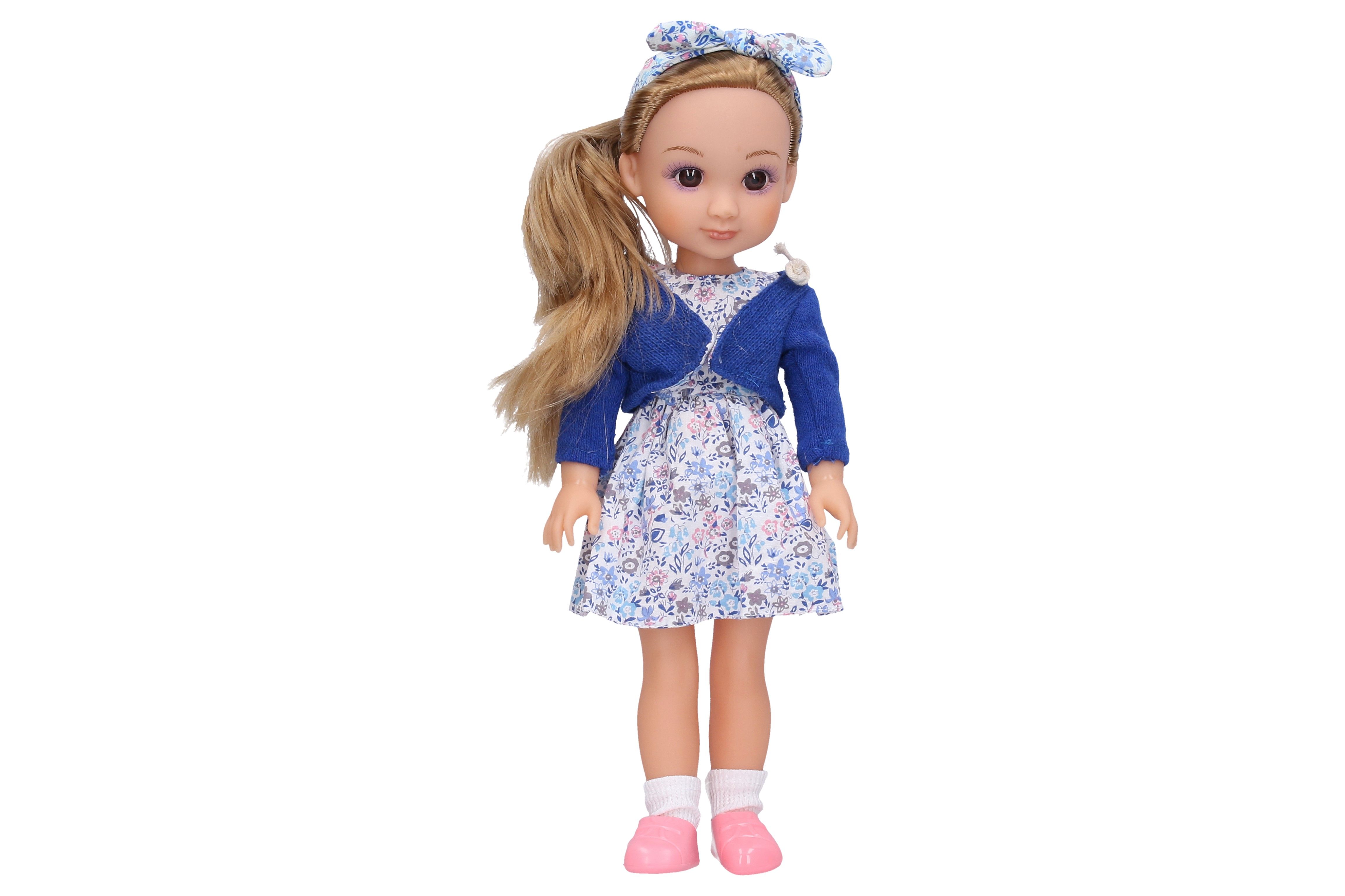 Panenka s šátkem. Velikost 35cm. Zvukové efekty. obsahuje: panenku, kabelku, hřeben. 3xAG13 baterie součástí.