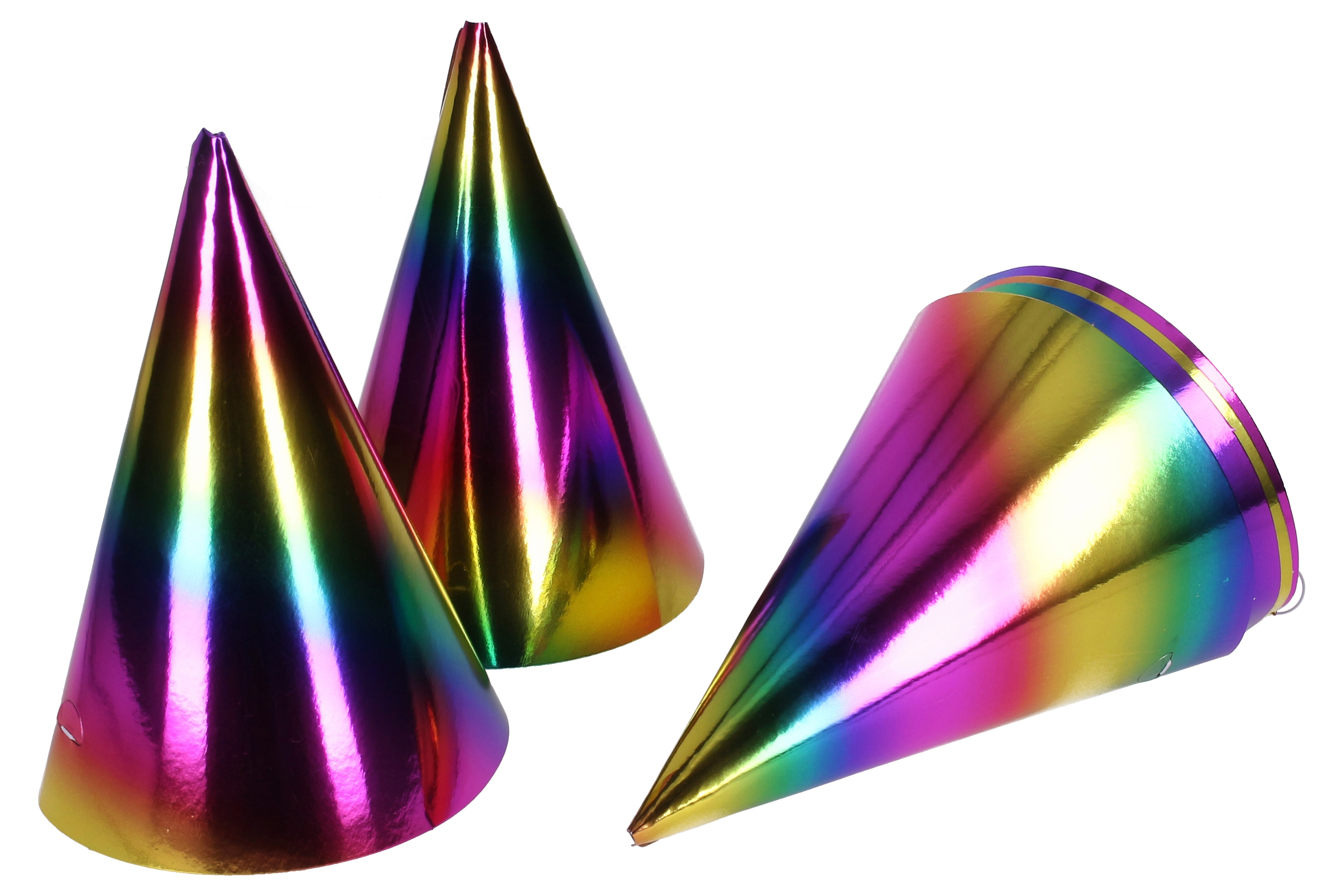 Párty kloboučky nesmí chybět na žádné narozeninové oslavě! Čepičky s motivem duhy mají uchycení na gumičku, pro lepší fixaci na hlavě.