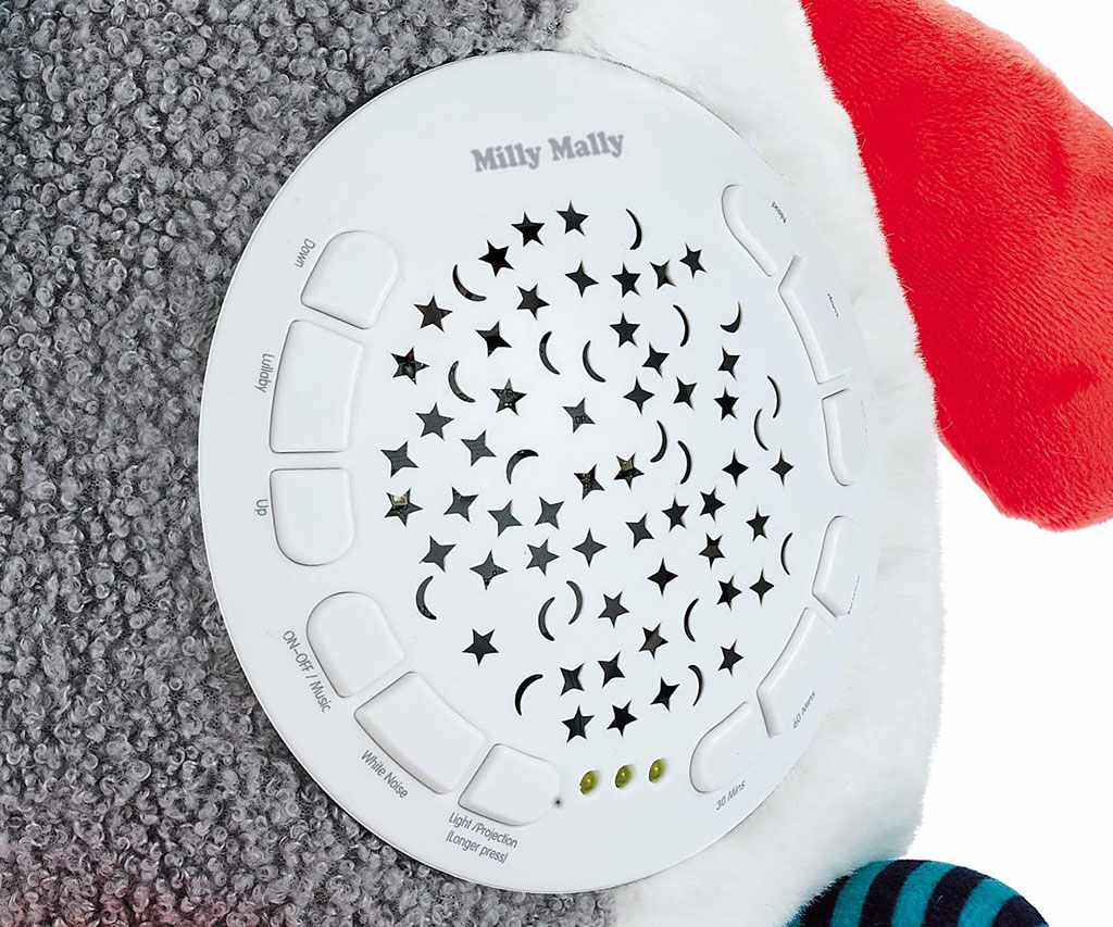 Můžete nastavit vhodnou dobu trvání: 30, 60, 90 minut. K dispozici je 5 úrovní hlasitosti. Skvělým doplňkem jeho funkce je 5 druhů bílého šumu, který má na batole obzvláště uklidňující účinek umožňující mu zklidnit se a rychleji usnout. S touto hračkou uslyšíte jemné zvuky: zurčení vody se zvuky ptáků, tlukot srdce, kapání vody, zpěv ptáků nebo padající déšť.