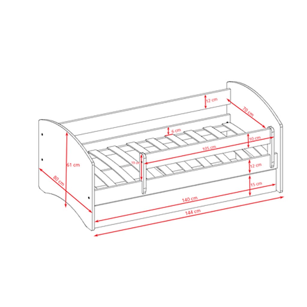 Jednolůžková postel se zábranou je vyrobena z kvalitní nábytkové desky o tloušťce 18 mm. Je dostupná v několika velikostech a barevných variantách. Pohádkové motivy zajišťují široký výběr a možnost personalizace.