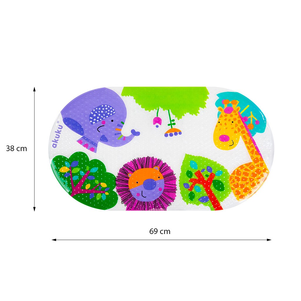 Protiskluzová podložka značky „akuku“ je určena k použití v dětské vaničce, vaně i sprchovém koutě. Zajišťuje bezpečnost při koupání. Barevný potisk zpestří každodenní péči.