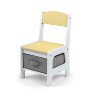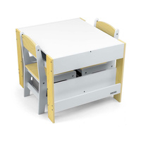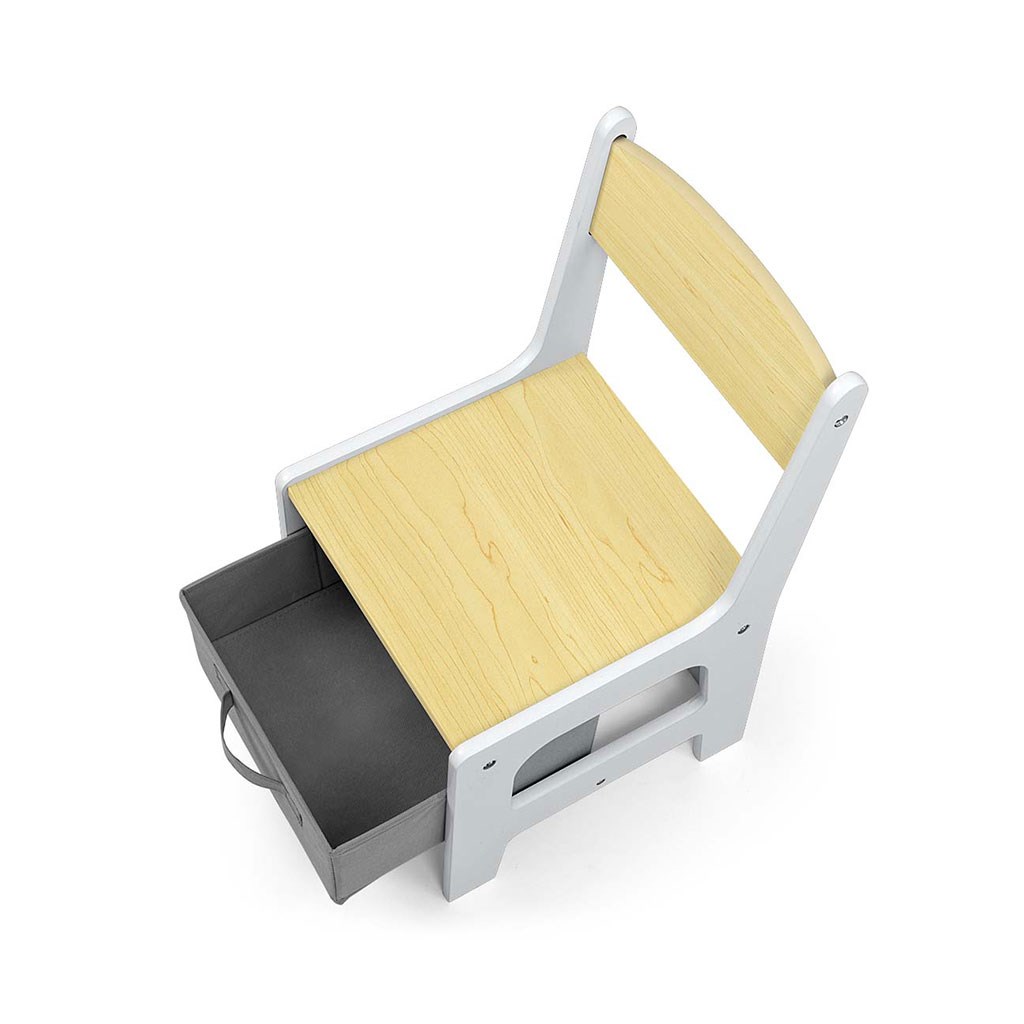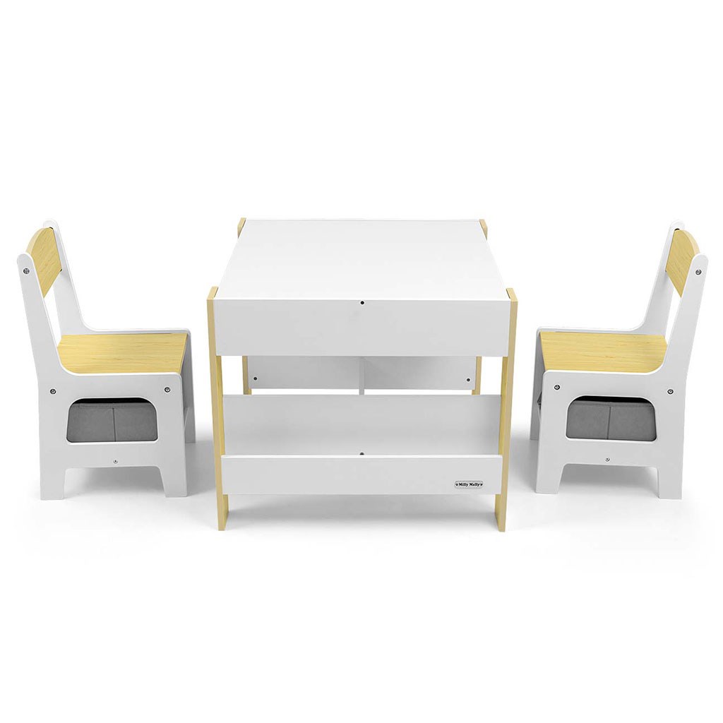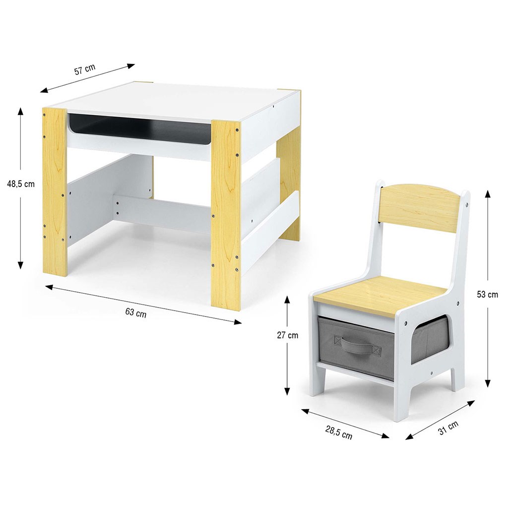 Multifunkční sada nábytku pro děti. Stůl SVEN se 2 židlemi v bílé a šedé barvě s šedými doplňky je vyroben tak, aby dětem poskytoval: pohodlí, prostor pro kreativní hru, malování, psaní a maximální komfort při činnostech. Sada obsahuje 2 židle se 2 látkovými úložnými pomůckami zasunutými do police pod židlemi. Stůl je vybaven obrovským úložným prostorem umístěným pod oboustrannou odnímatelnou deskou. Má také boční úložné police. Na jedné straně desky stolu je velká kreslicí deska. Židle jsou lehké a děti s nimi mohou volně pohybovat. Nábytek je vyroben s výjimečnou precizností a pečlivostí. Obě židle mají zaoblené rohy, které chrání dítě před zraněním. Všechny prvky konstrukce stolu a židlí zajišťují vysokou stabilitu a minimalizují riziko pádu. Souprava Sven vyrobená z MDF je odolná a snadno se udržuje. Sada nábytku se snadno sestavuje a všechny součásti potřebné k montáži jsou součástí balení.