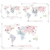 kontinenty, ostrovy a doplňkové (vzdělávací) prvky M (130x85 cm). Přesné rozměry každé části nálepky jsou uvedeny na poslední fotografii. Upozornění: Nedoporučujeme aplikovat naše samolepky na stěny natřené latexovými, hladkými nebo voskovými barvami. Baleno v eko tubách.