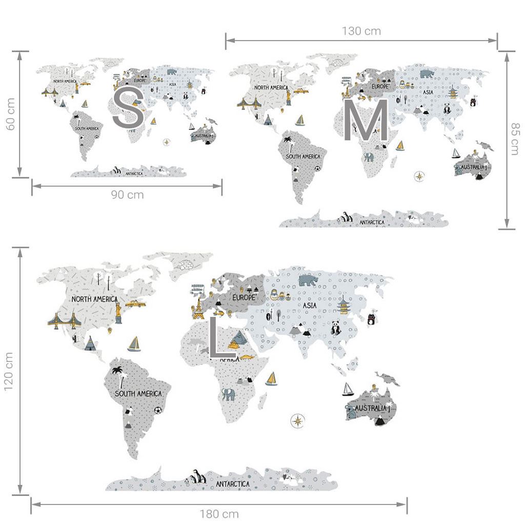 kontinenty, ostrovy a doplňkové (vzdělávací) prvky M (130x85 cm). Přesné rozměry každé části nálepky jsou uvedeny na poslední fotografii.
