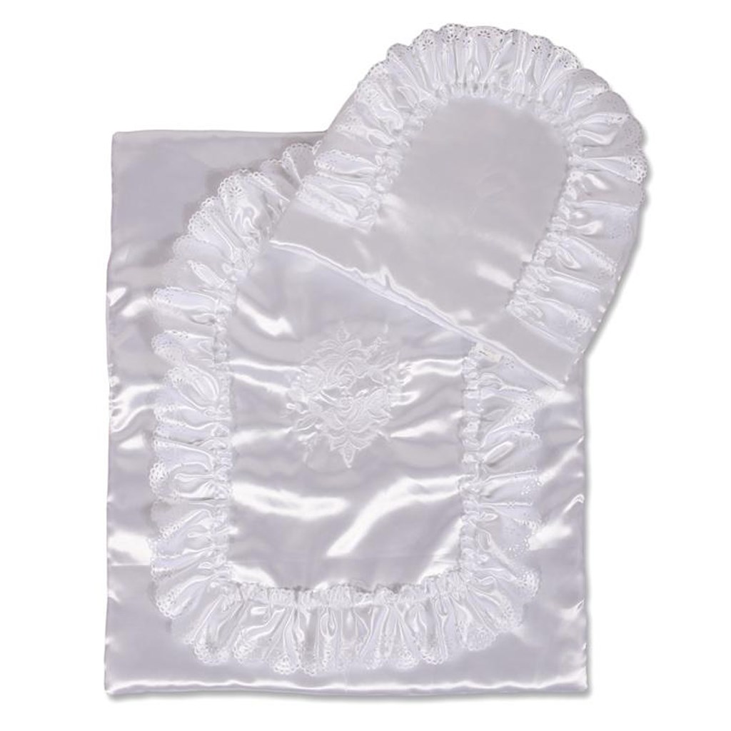 Nádherný saténový 2-dílný set do kočárku. Obsahuje polštářek a peřinku s krajkou po celém obvodu. Výplň: antialergické vlákno. Rozměry: 40x80 cm. Spodní materiál 100% bavlna.