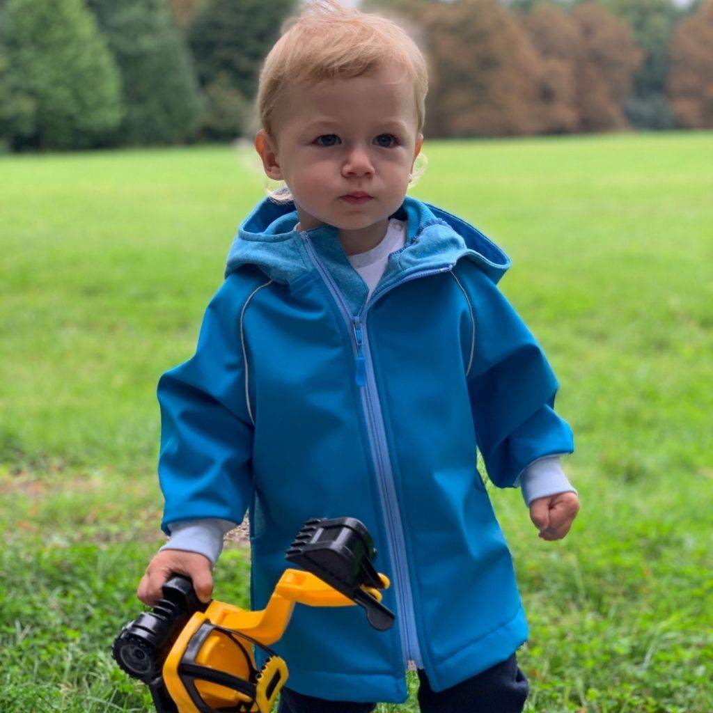 Nápaditá softshellová kojenecká bundička New Baby. Bundička je vyrobena v České republice z kvalitního materiálu softshell. Materiál je hladký, elestický, měkký a příjemný na dotek. Do určitého stupně je také voděodolný, nenasakuje vodu a je odolný vůči znečištění. Praktické zapínání na zip po celé délce velmi usnadní oblékání a přebalování. Zip je po celé délce podšitý látkou, a tím je zamezeno profukování větru na pokožku miminka. Bunda má praktickou kapuci, širší pružné lemy na rukách a v pase a celá vnitřní strana je zateplená krátko střiženým polarem, který zvyšuje komfort nošení a zajišťuje teplo. Na rukávcích jsou našité reflexní paspulky. Softshellová bundička je vhodná jako sportovní oblečení, je odolná větru a zároveň prodyšná. Miminko se bude cítit velmi pohodlně a příjemně.