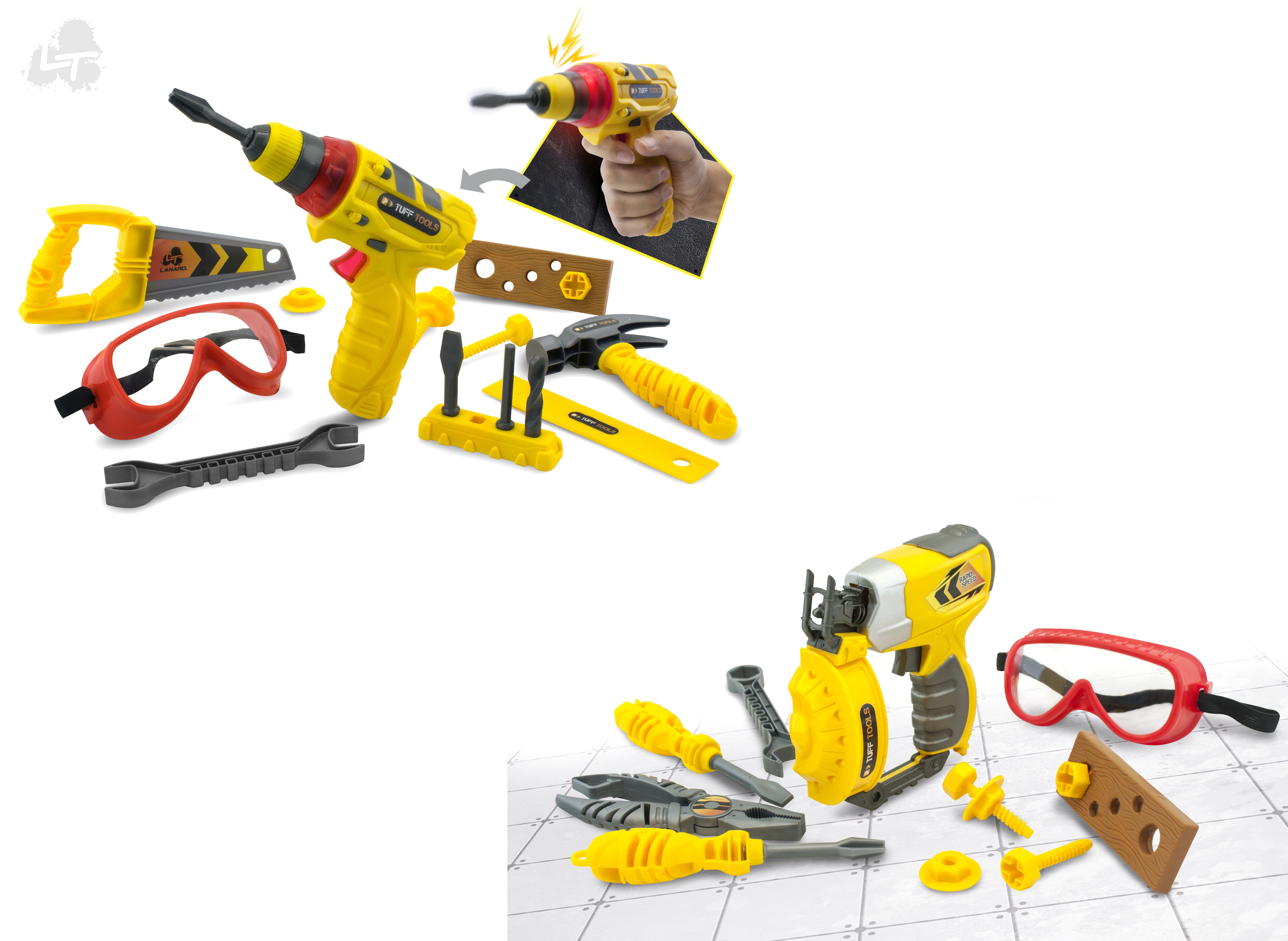 Tuff Tools Nářadí set s brýlemi. Obsah balení - elektrická vrtačka se světelnými a zvukovými efekty, ochranné brýle, šrouby s maticemi 6ks, 4 vyměnitelné vrtáky a šroubováky, klíč, pila, kladívko. 3xAG13 baterie jsou součástí balení.