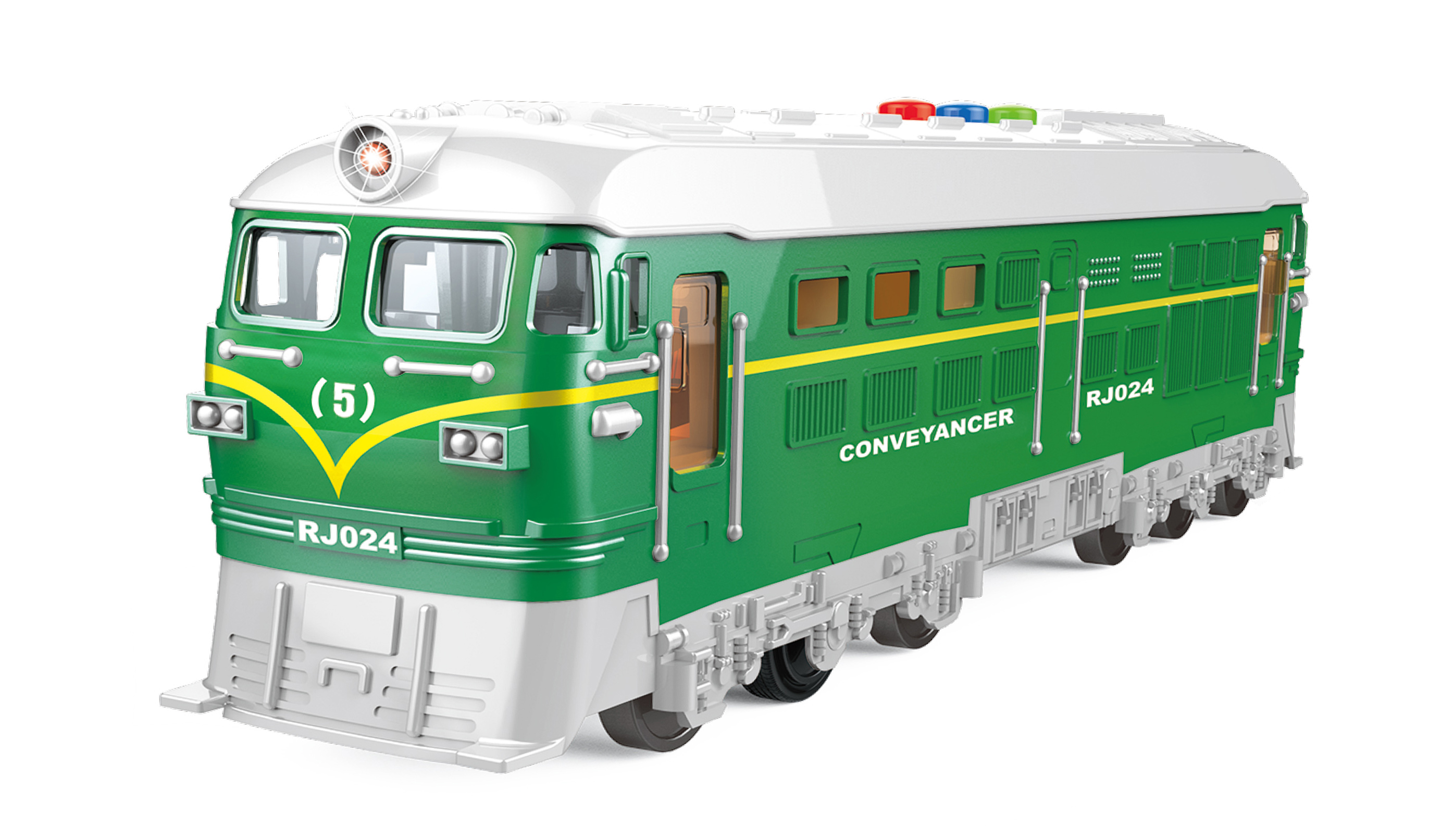 Vlak na setrvačník s efekty. Velikost 23 cm. Vydává světelné a zvukové efekty. Aktivace tlačítky na střeše (zvuky vlaku a železnice). Baterie 3xAG13, součástí balení.