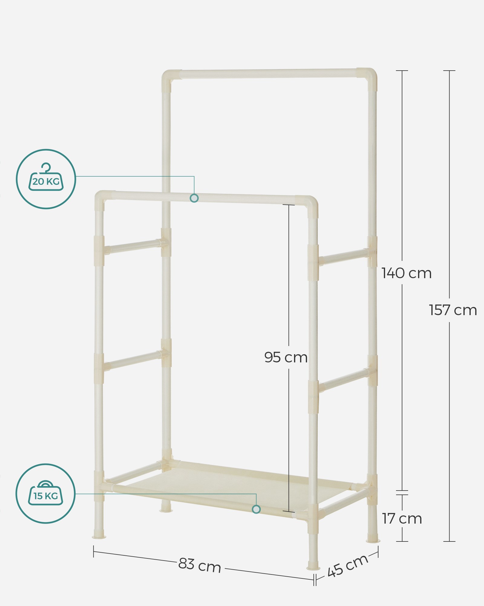Železná konstrukce zajišťuje stabilitu nábytku, takže je ideální po celý rok – zejména v zimě, kdy na něj zavěsíte těžké kabáty a bundy. Na tyčích je také místo pro slavnostně vyžehlené košile a šaty.