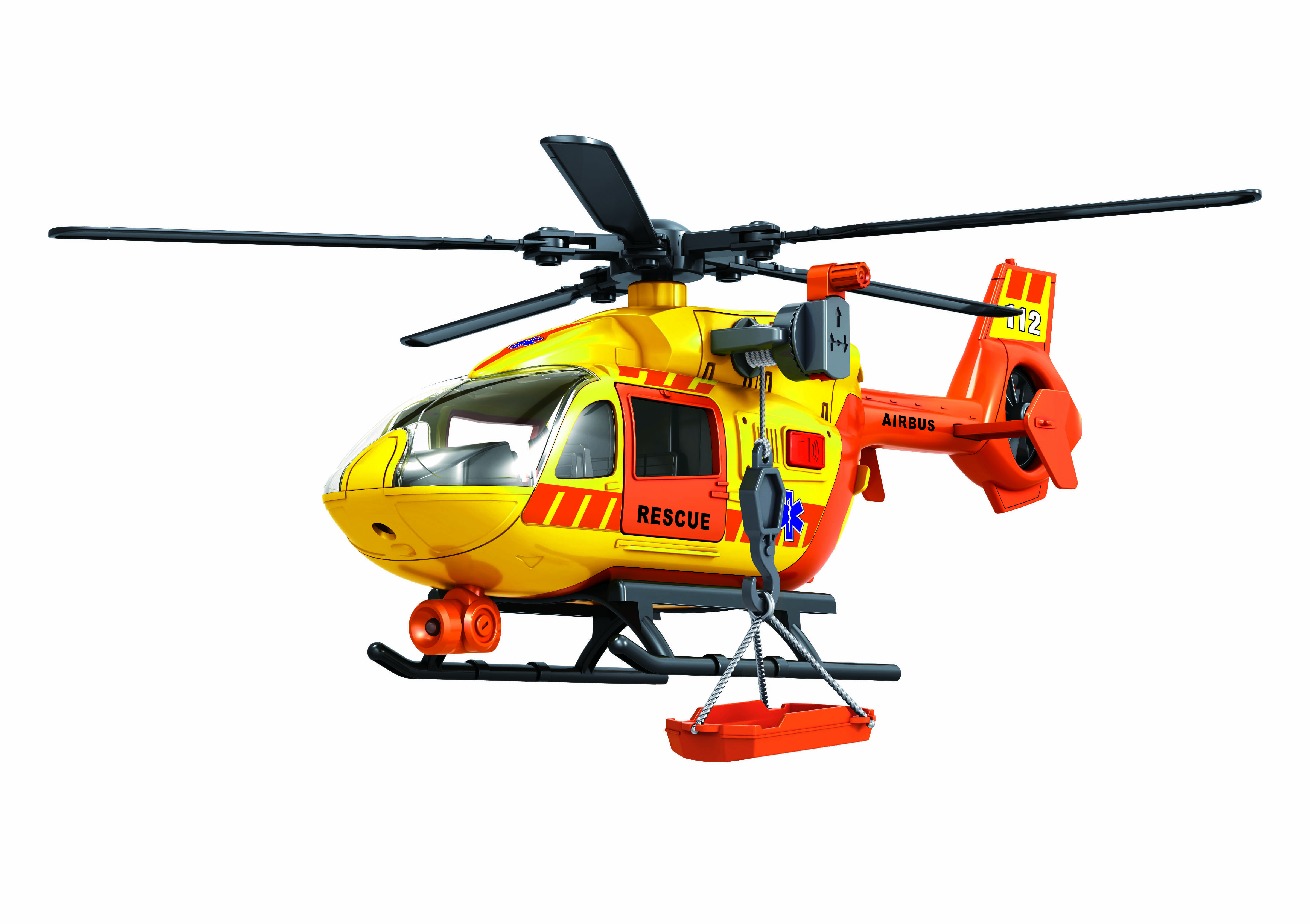 Vrtulník záchranářský s efekty. Rozměry 38x12x16 cm. Světelné a zvukové efekty tlačítkem na boční straně vrtulníku. 2xAAA baterie ze spodní strany vrtulníku součástí. Otevírací přední a zadní (nakládací plocha) dveře. Vysunovací lano s hákem pomocí otočné páčky. Součástí lehátko na hák. Funkce na obrázcích na obalu.