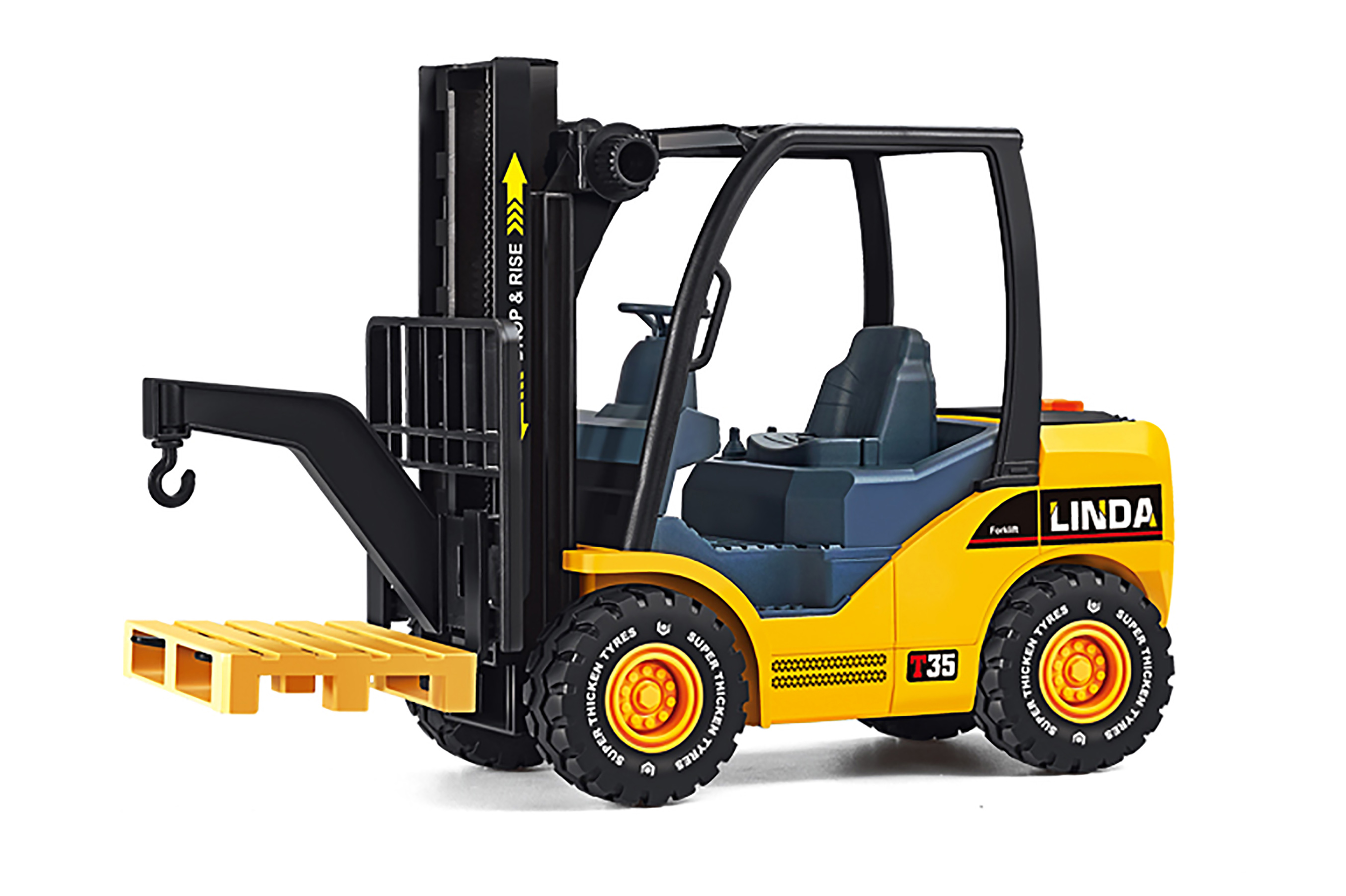 Vysokozdvižný vozík s efekty s paletou. Rozměry 31x10,5x18 cm. Obsah balení - vozík, paleta. Na setrvačník. Vydává světelné a zvukové efekty. Aktivace tlačítky v zadní části (zvuk motoru, zdvihání, troubení). Manuální zdvihání, kolečkem v přední části. Baterie 3xAG13, součástí balení.