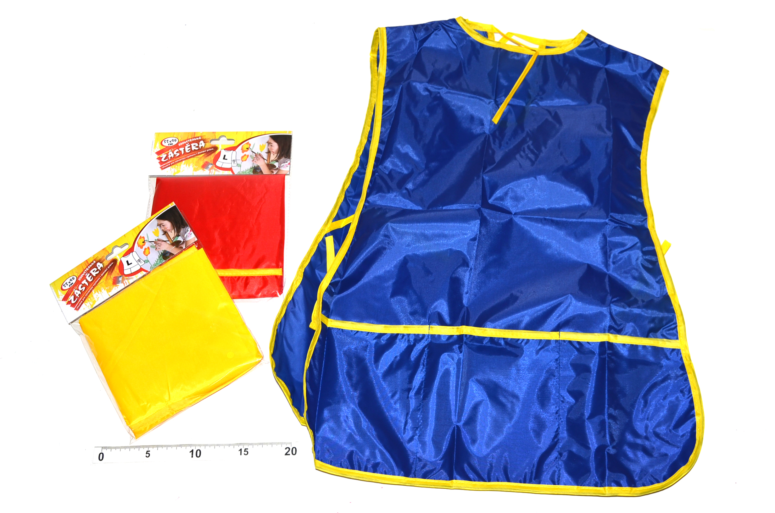 Oboustranná zástěrka na výtvarnou výchovu má zavazování v pase, na přední části má 3 kapsičky. Už žádné ušpiněné trička ani kalhoty při malování vašich ratolestí.